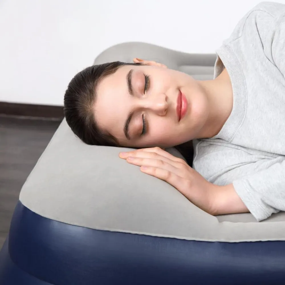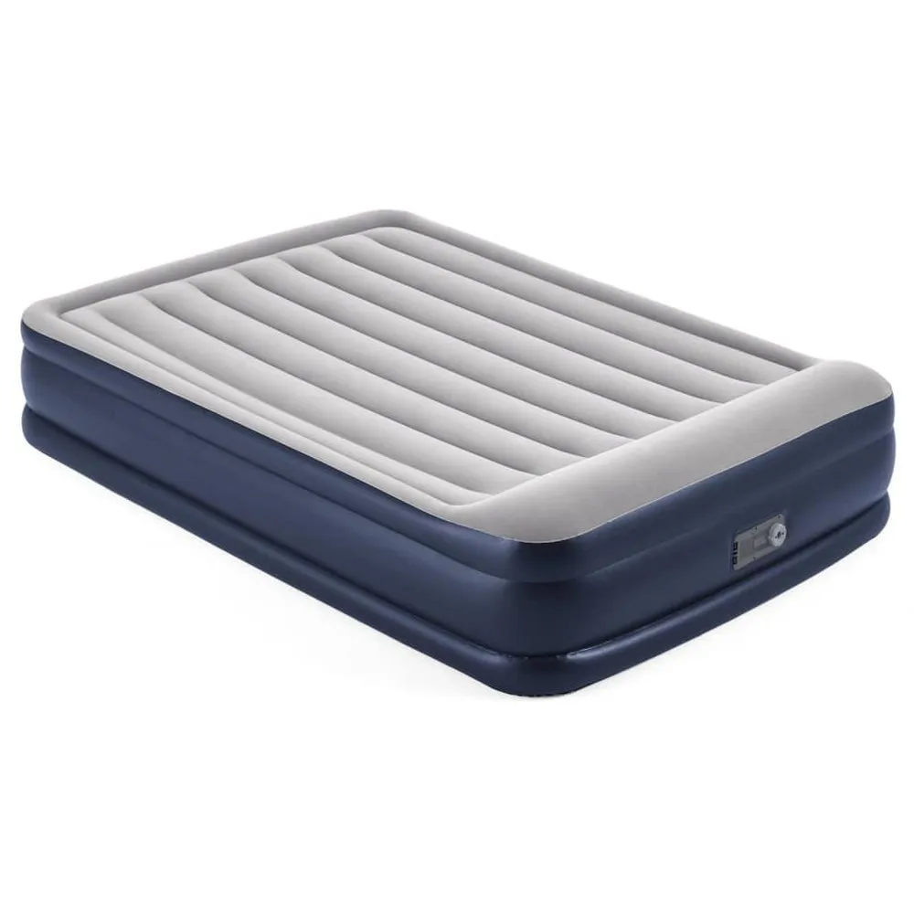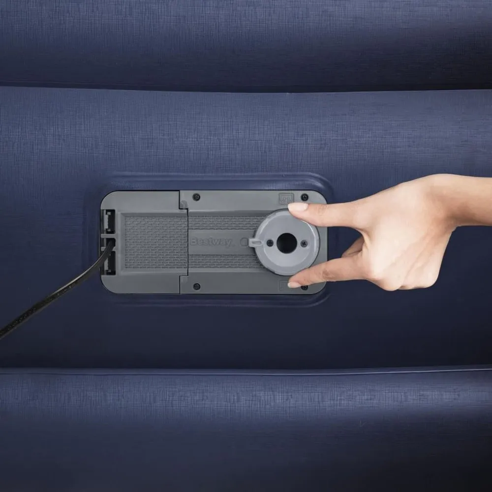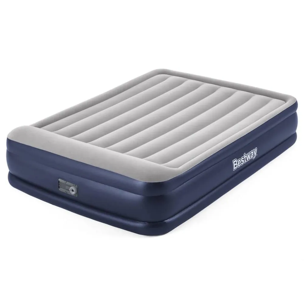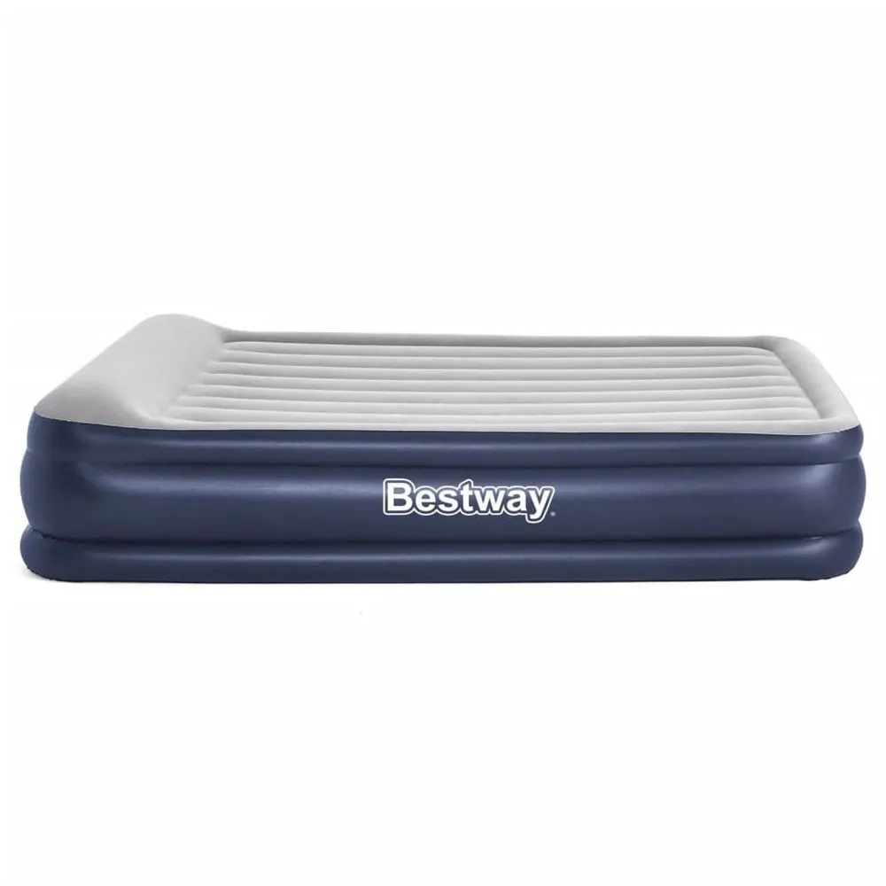 This 2-person blue and grey Tritech airbed from Bestway is a strong air mattress for indoor use. It is made of pre-tested vinyl, equipped featuring a built-in air pump and provided with a pleasant roughened top layer. The airbed operates on an electric air pump Tritech™ and a 95 W power. Thanks to this electric air pump, the bed inflates in just 4 minutes. The bed has a comfortable edge around it, preventing it from rolling away. The Tritech I Beam construction consists of 3 durable layers so that the bed retains its shape and remains firm throughout the night. It is designed with a pleasant roughened top layer and a built-in pillow. The delivery includes a repair patch and a storage bag. Colour:Blue and grey Material:PVC Dimensions: 203 x 152 x 46 cm (L x W x H) Bed Height with pillow: 46 cm / 18” Bed Height without pillow: 38 cm / 15” Weight Capacity: 300 kg (661 lbs) Power: 95 W Built in electric air pump Tritech™ Power supply: 220-240 V User capacity: 2 Inflates in 4 minutes Pleasant roughened top layer Comfortable edge all around Contrusted with 3 durable layers Internal beams are polyester mesh encased in durable PVC Comfortable flocked sleeping surface Built-in pillow For indoor use Delivery includes: 1 x storage bag 1 x repair patch
