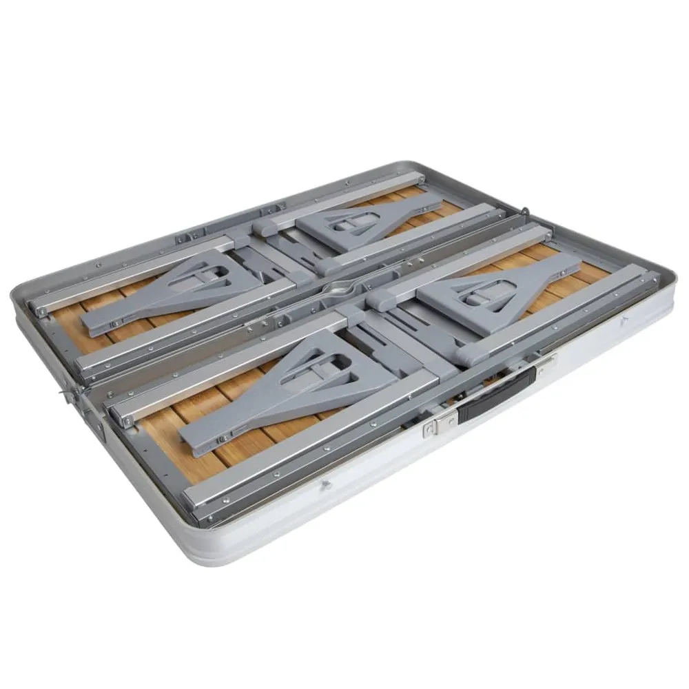 Enjoy and have a great time with your family or friends with this folding picnic table set from Bo-Camp! The outdoor table consists of a large tabletop and 4 seats. The set is highly stable and durable with the aluminium frame and the heat- and water-resistant bamboo top. The table and the stools can be folded into a compact package for easy transport and storage. So, it is suitable to use in your garden and also for a picnic in the park or campground. Colour: Brown and silver Material: Bamboo, aluminium Overall dimensions(unfolded): 136 x 85 x 67 cm (L x W x H) Overall dimensions (folded): 85 x 11 x 34 cm (L x W x H) Seat height: 41 cm Weight: 14,5 kg Maximum weight capacity: 80 kg per seat Foldable for easy transport and storage