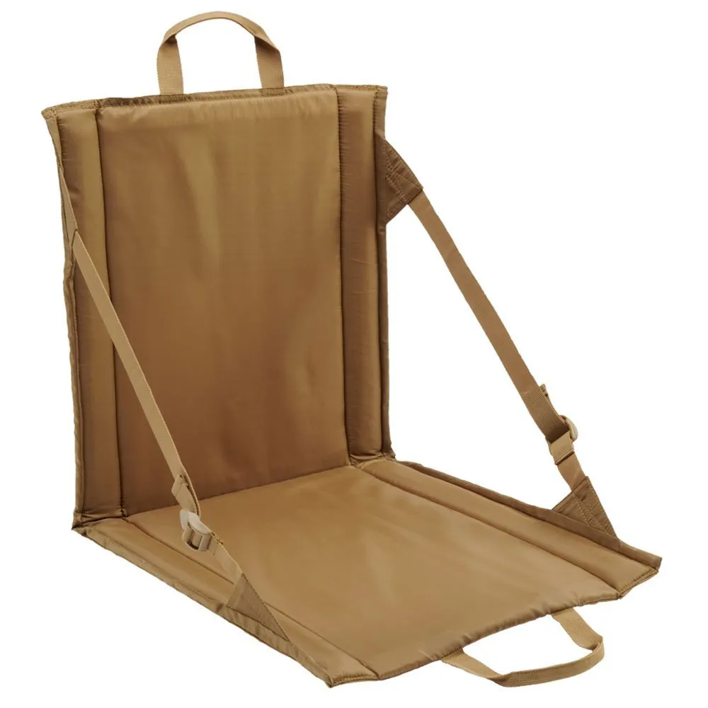 carrying and folding seat with backrest, ideal for camping, festivals, hiking, beach vacations or in daily life, two-part net bag for water bottles and other equipment, stable carrying handles, velcro fastener, soft, comfortable seat and backrest, backrest adjustable in angle, robust polyester material, easy to clean.