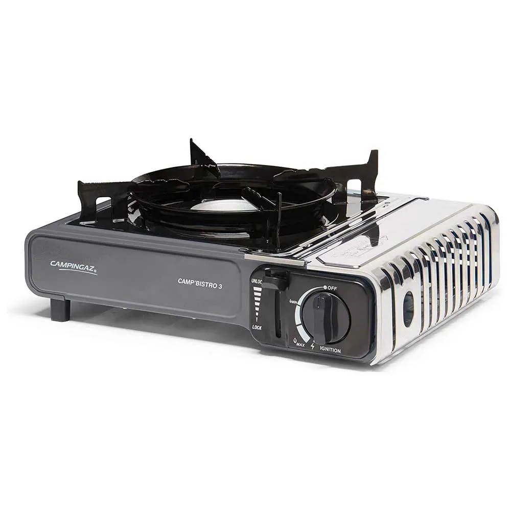 The last version of Campingaz success story, the Camp‘Bistro 3, with 2 safety systems integrated , a stainless steel cartridge cover and an upgraded pan support, ensuring stability and a safe usage of the stove . This robust stove comes with its own hard plastic carry case, for easy transport and storage.