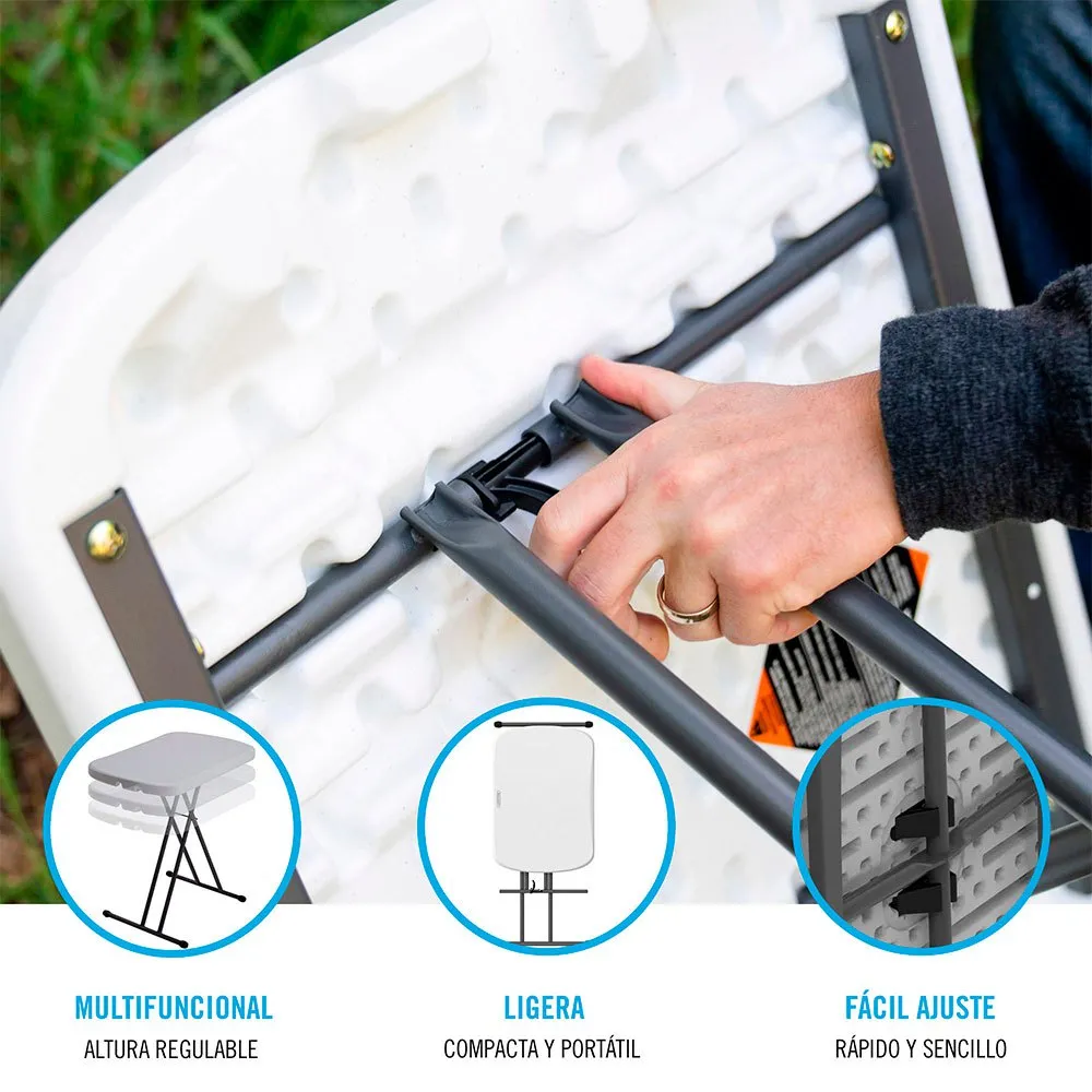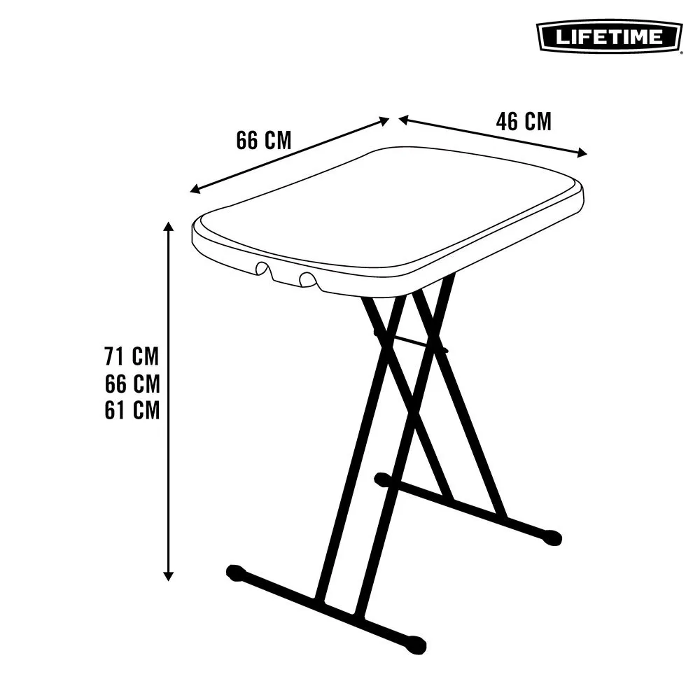 Light, compact and resistant, the table measures 66×46 cm and is adjustable in 3 heights:61/66/71 cm.