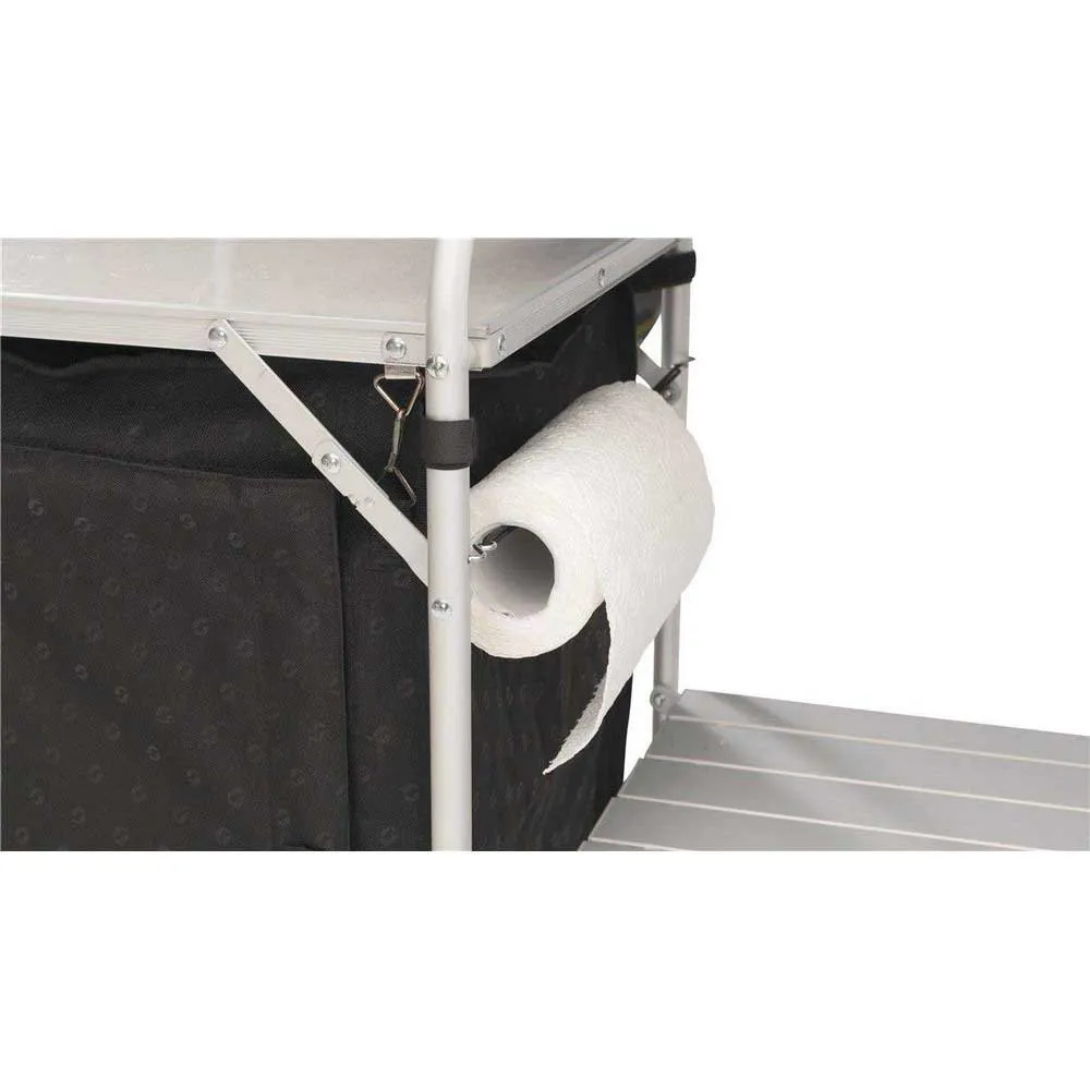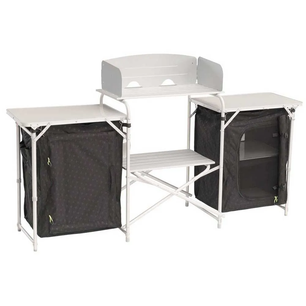 Camrose Kitchen Table has a stylish embossed black fabric with a solid aluminium table top plus two self units with updated table tops.