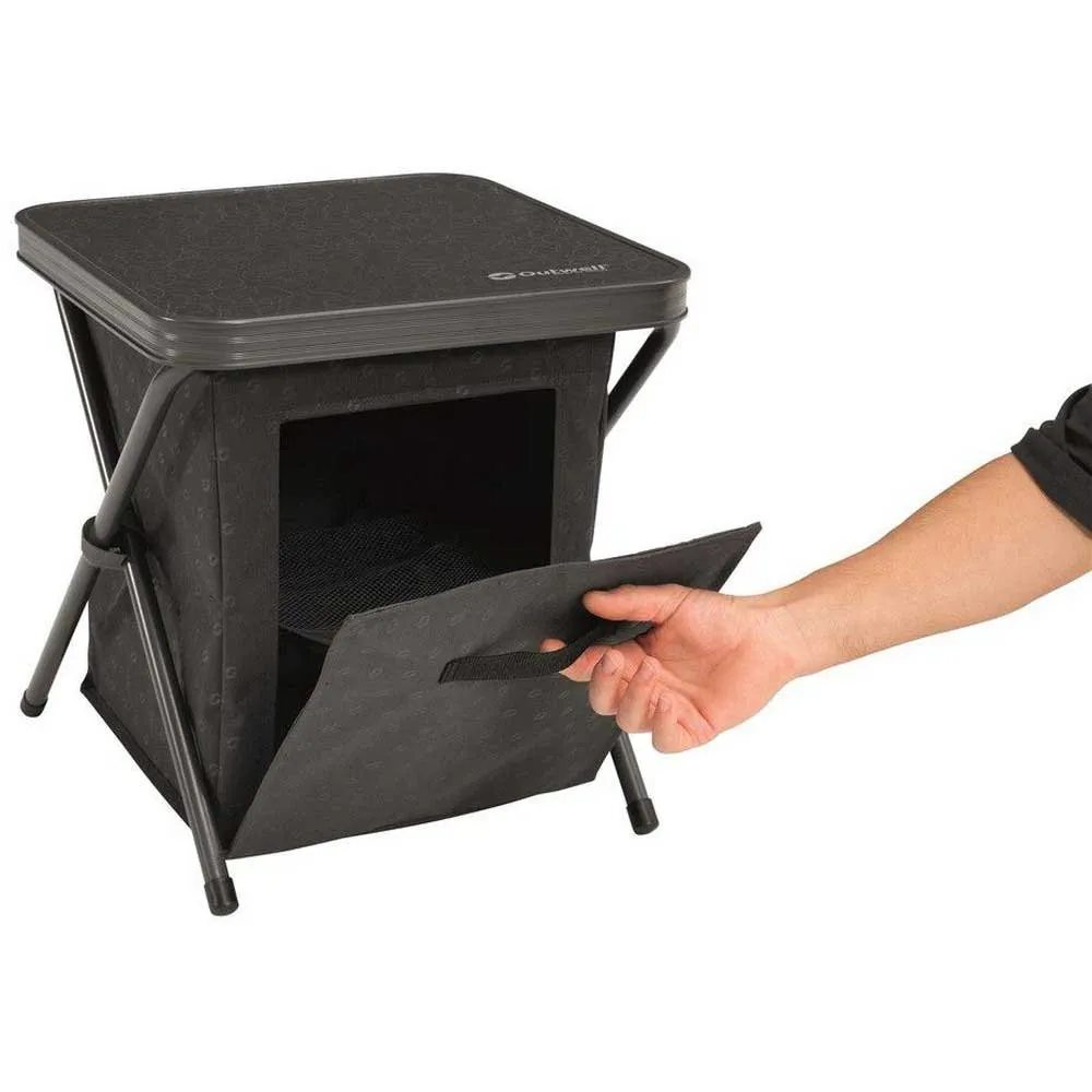 Solid drop down door with handle provides noise free and home-like easy access to storage space.